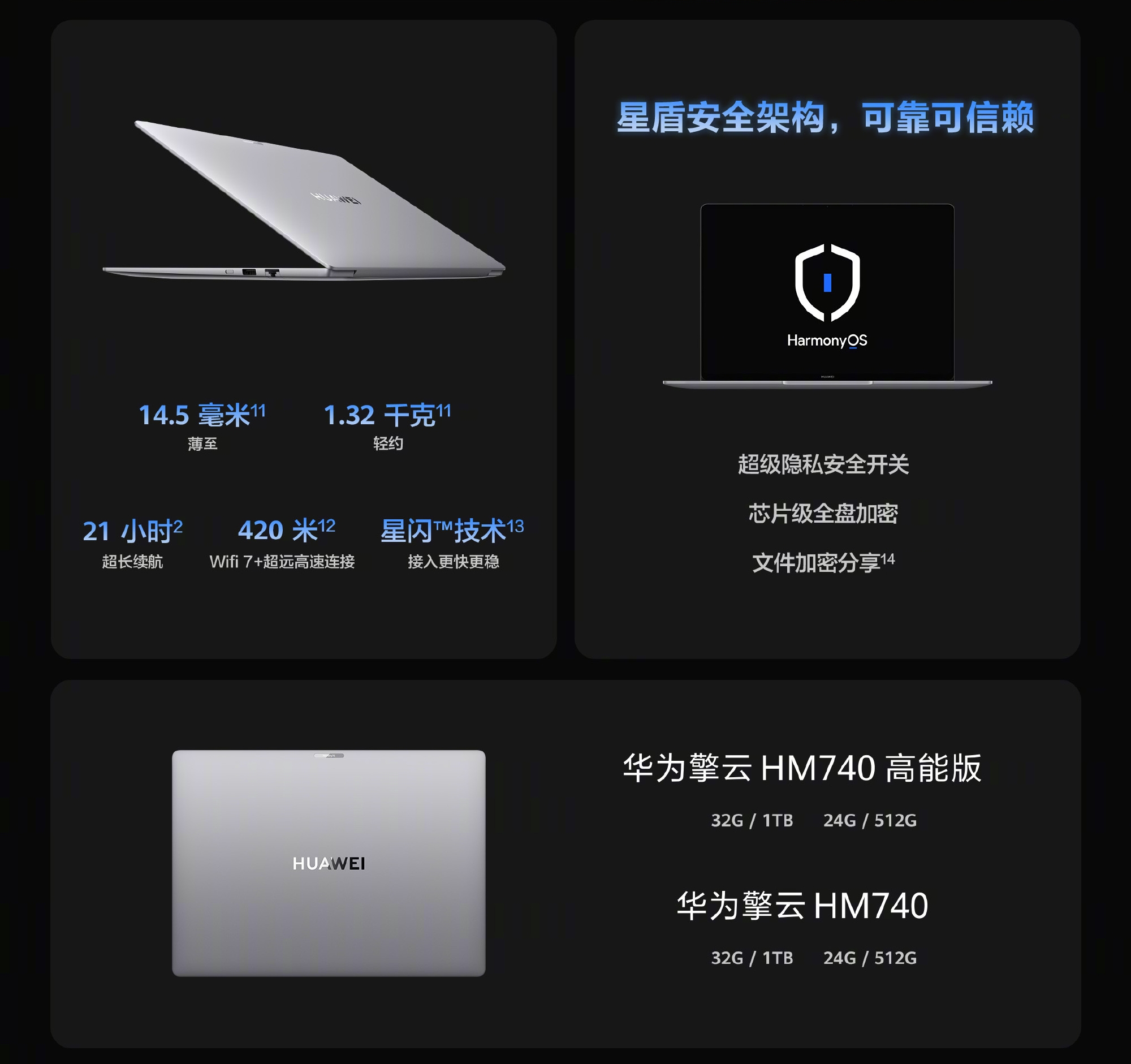 擎云HM740整机比较轻便,厚度约14.5mm,重量控制在了1.32KG。搭配WiFi7+超远高速连接,连接距离可达420米。同时华为擎云MH740还支持星闪连接技术,接入更快更稳定。