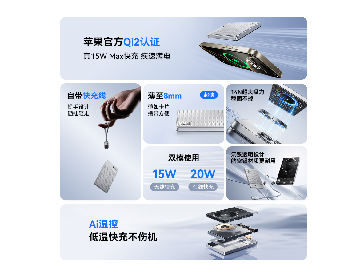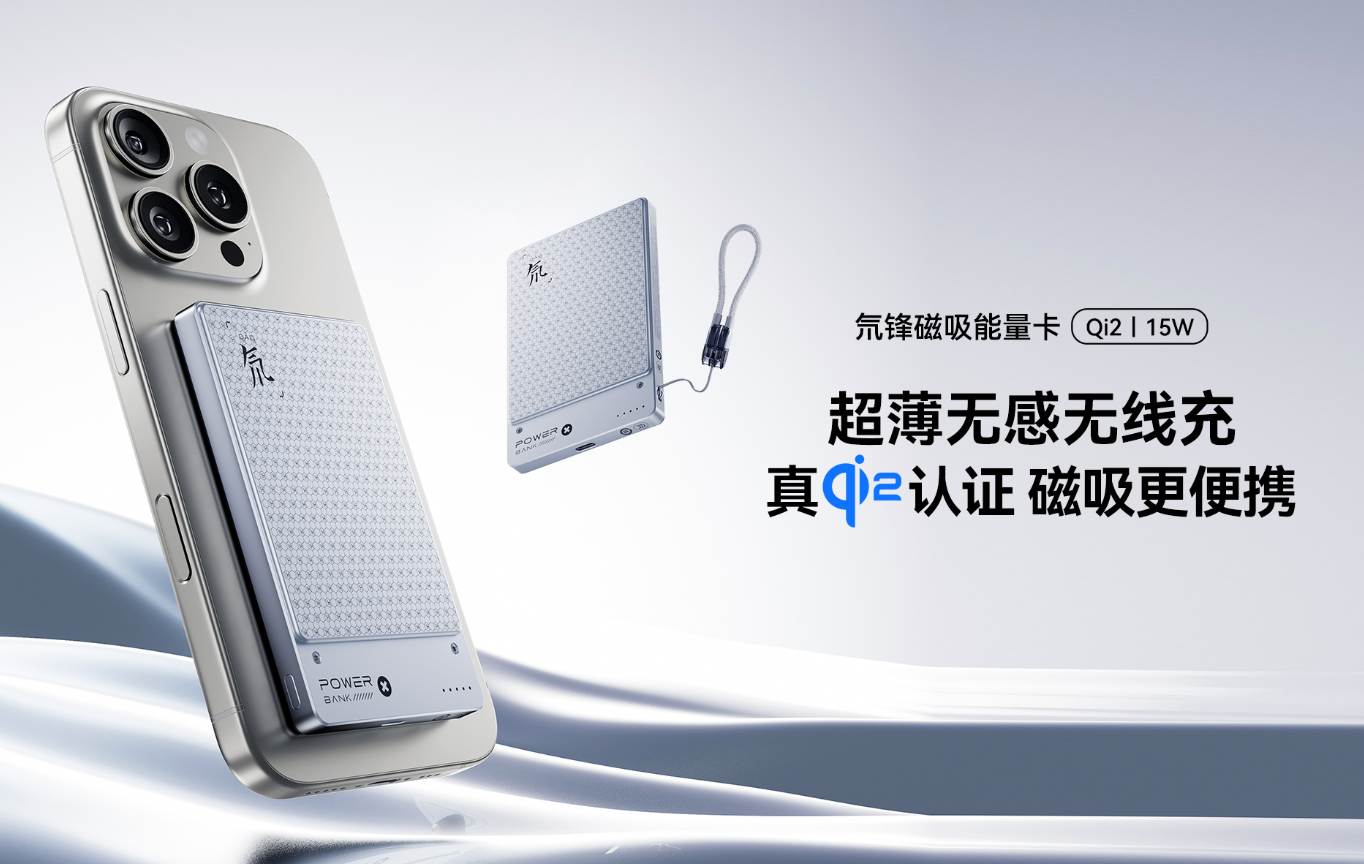 产品参数上,红魔氘锋能量卡采用了氘系透明设计和航空铝材质,机身薄至8mm,拥有14N超大吸力,可稳固吸附不脱落;通过苹果官方Qi2认证,支持15W无线磁吸充电。值得提及一点,这款充电宝自带提手式快充线,无需额外带线,随走随充。