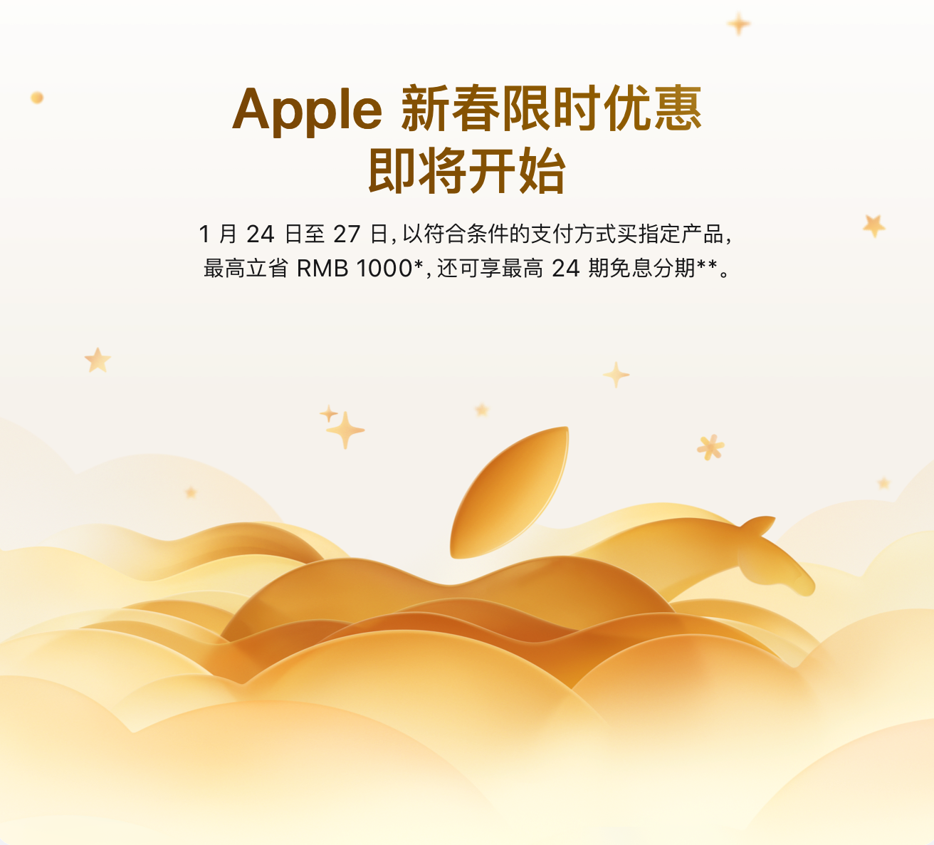1月22日消息,苹果中国官网现已上线新春限时优惠活动,活动时间为2026年1月24日0时1分至1月27日23时59分,用户以符合条件的支付方式购买指定产品,最高可立省1000元。