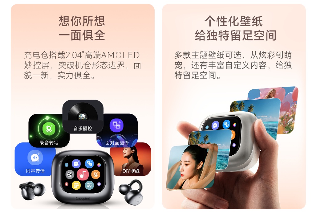 据官方介绍,Air 1采用了市面上主流的耳夹式设计方案,搭配零压钛芯记忆无感C桥,佩戴稳固不压耳,同时还有银离子+亲肤涂层,能有效抑制汗液细菌,对运动场景表现友好。Air 1单耳重量约6.1g,内置有钢壳电池,单耳续航支持8小时连续畅听,配合电池仓可实现42小时的超长续航,更好兼顾到舒适与续航。值得提及的是,Air 1的电池仓搭载了2.04''高端AMOLED妙控屏,支持自定义主题壁纸,彰显个性体验。