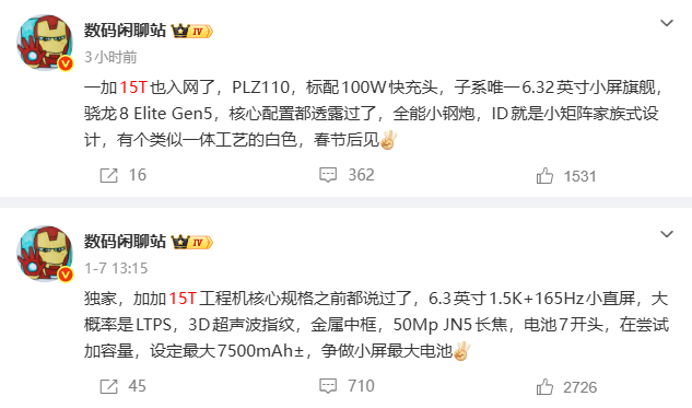 1月22日,知名博主@数码闲聊站爆料一加15T入网,型号为PLZ110。这也是近期国产厂商子系唯一6.32英寸小屏旗舰。此外,据称一加15T定位性能小钢炮,因此将配备骁龙8 Elite Gen5处理器,ID则为小矩阵家族式设计。同时博主还透露一加15T会有类似一体工艺的白色版本。