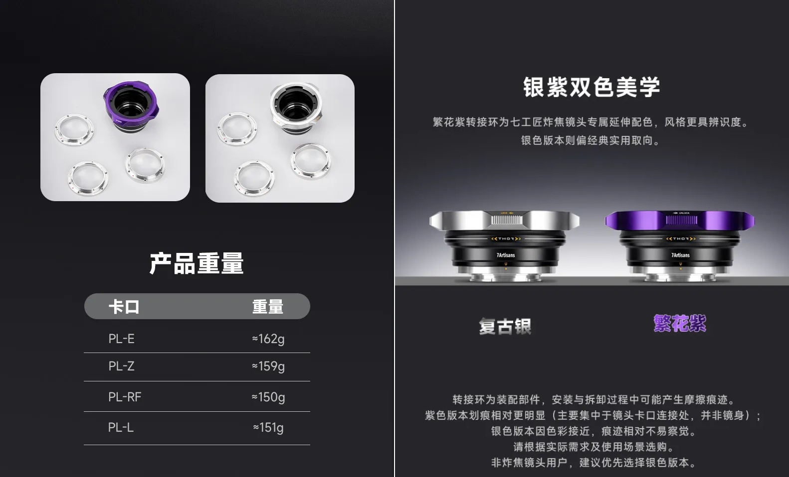 据悉,该转接环套装号称“一环四用”,可更换PL-E、PL-Z、PL-RF、PL-L四种卡口,提供复古银、繁花紫2款配色可选,其中繁花紫转接环为七工匠炸焦镜头专属延伸配色,风格更具辨识度,银色版本则偏经典实用取向。